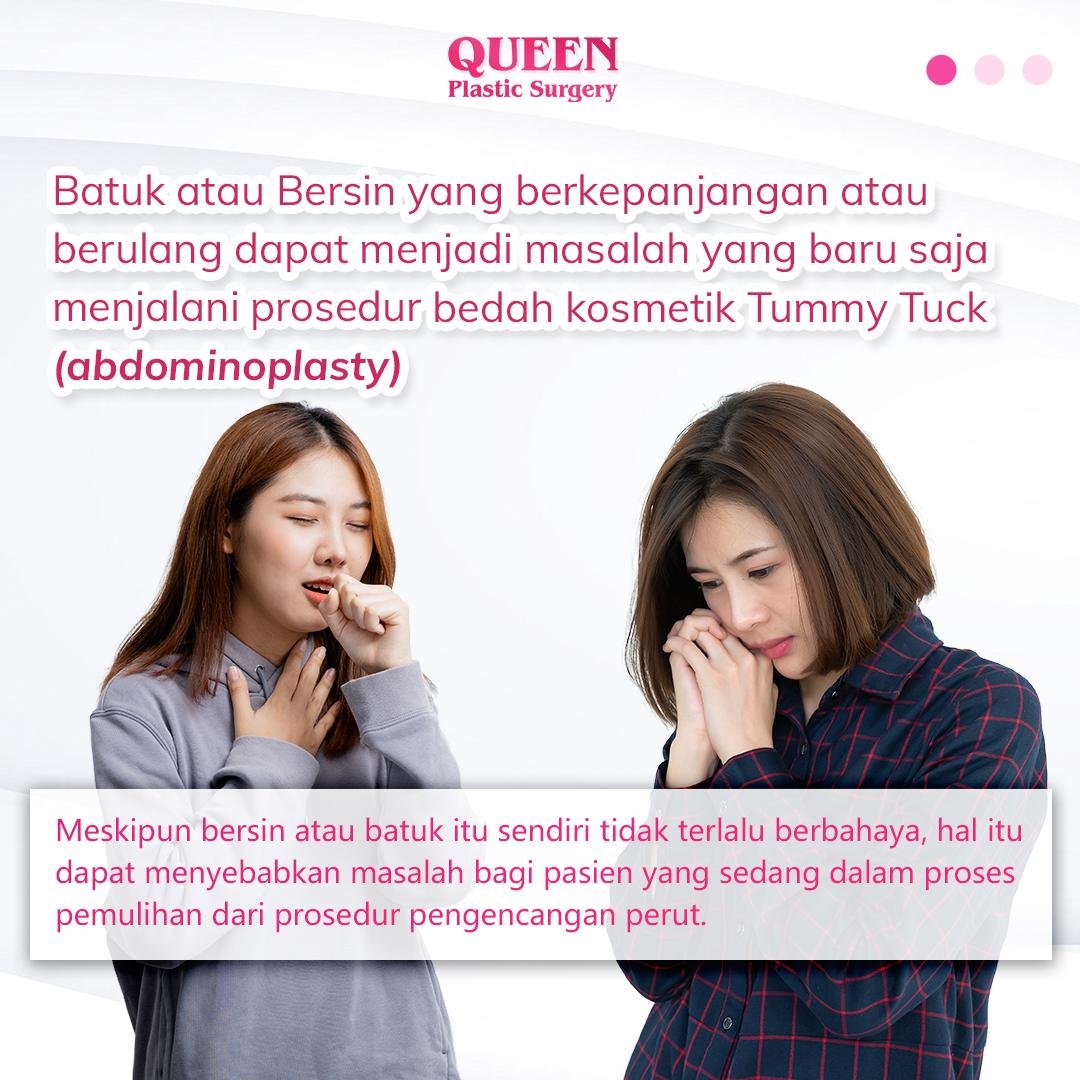 Batuk atau bersin yang berkepanjangan atau berulang dapat menjadi masalah bagi pasien yang baru saja menjalani prosedur bedah kosmetik tummy tuck (abdominoplasty), karena otot perut sedang dalam proses pemulihan. Meskipun bersin atau batuk itu sendiri tidak terlalu berbahaya, hal itu dapat menyebabkan masalah bagi pasien yang sedang dalam proses pemulihan dari prosedur pengencangan perut.