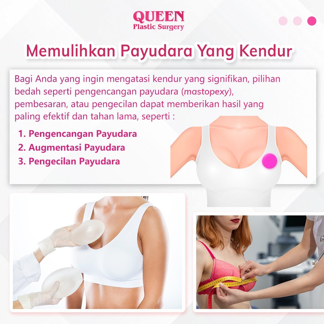 Bagi mereka yang ingin mengatasi kendur yang signifikan, pilihan bedah seperti pengencangan payudara (mastopexy), pembesaran, atau pengecilan dapat memberikan hasil yang paling efektif dan tahan lama.